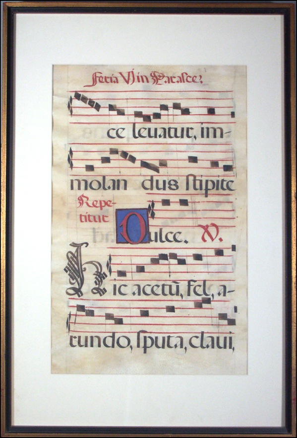 Beautiful antiphonal leaf on vellum with two large decorative initials, one in color, 14 x 22, Spain, seventeenth century. Matted and framed to an overall size of 21 x 31. In fine condition, with usual mild waviness and toning. R&R COA. Oversized.