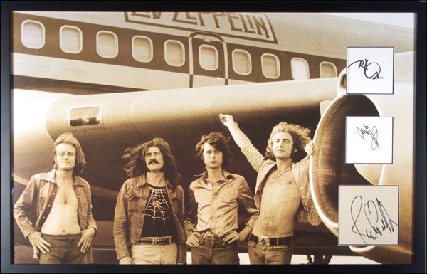 Felt tip signatures of Robert Plant, Jimmy Page and John Paul Jones on individual off-white and brown cards. All three are nicely matted behind a 30 x 20 dry mounted poster of the band posing by their plane, to an overall size of 32.25 x 21. In fine condition. COA Roger Epperson/PSA/DNA and R&R COA. Oversized.