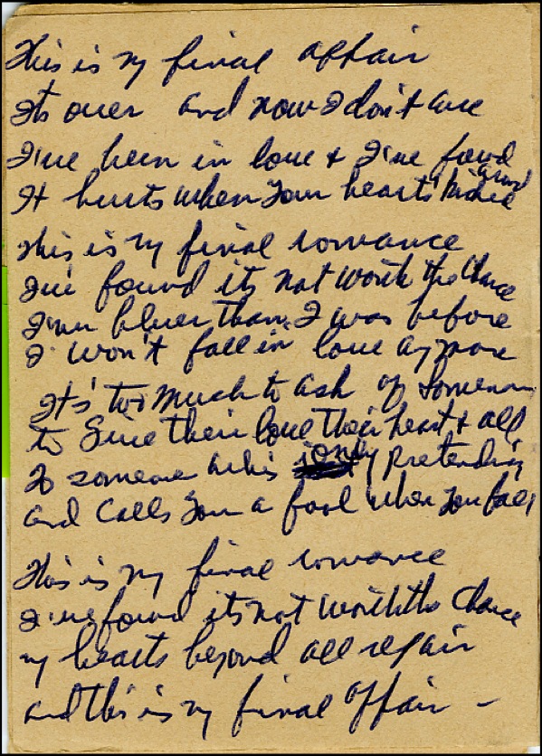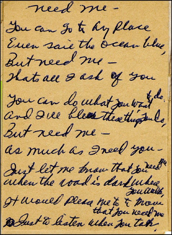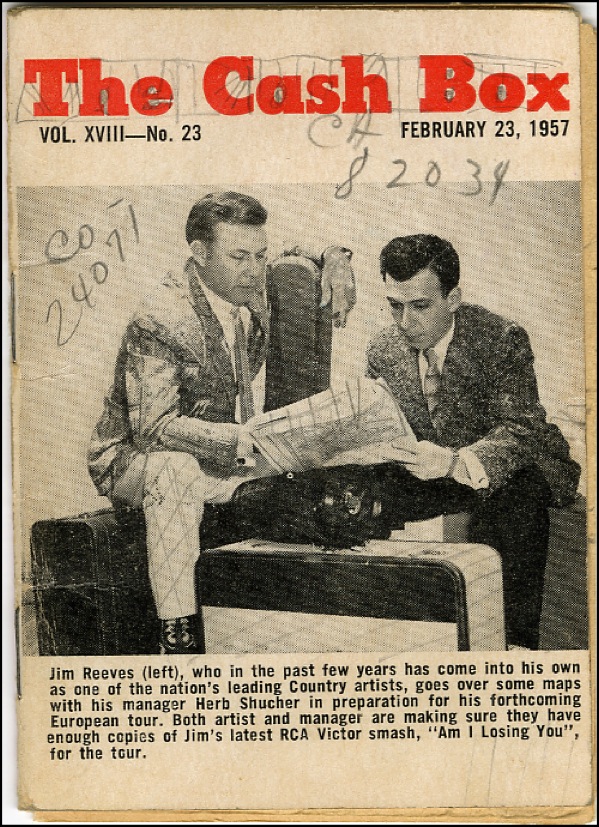 Cash Box note pad, 3.25 x 4.25, dated February 23, 1957, containing Reeve’s handwritten notations, a ballpoint signature “Jim Reeves,” and a handwritten draft of Reeves’ lyrics for the song entitled Need Me, which at the time of writing was four verses long. Note book also contains addresses and phone numbers. In fine condition, with notations to front cover, light toning to pages and mild handling wear. R&R COA.