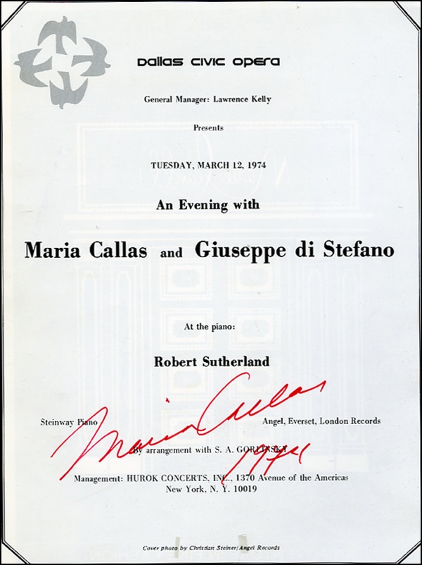 Celebrated opera singer. Inside program page, 7.5 x 10, for An Evening With Maria Callas and Giuseppe di Stefano at the Dallas Civic Opera on March 12, 1974, signed across the page in red felt tip “Maria Callas 1974.” In fine condition. R&R COA.