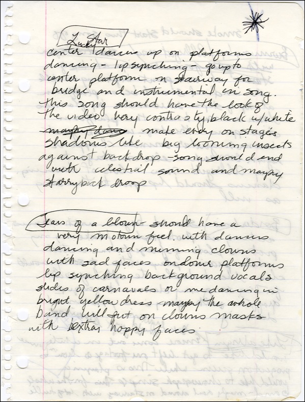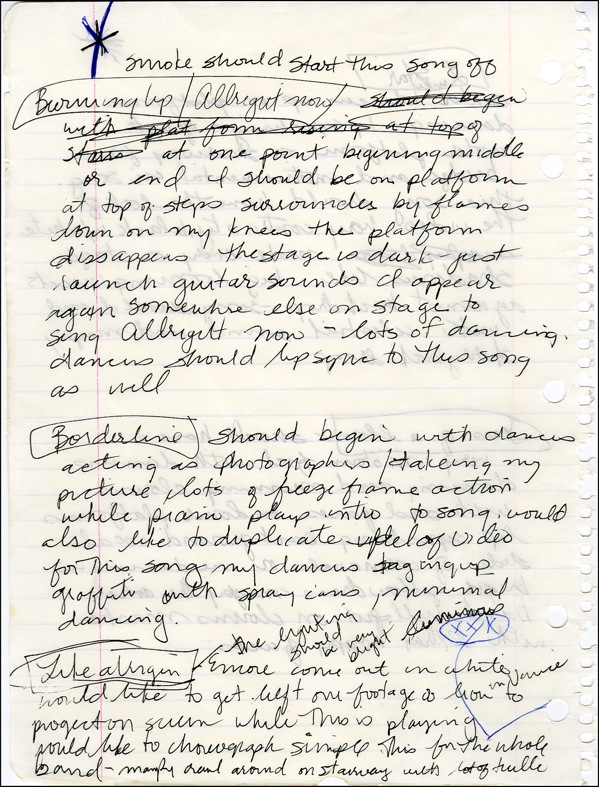 Madonna’s handwritten concert instructions on both sides of an 8 x 10.5 sheet of lined notebook paper. Madonna writes instructions for her concert performances of Borderline, Like A Virgin, Lucky Star, Burning Up and Tears Of A Clown. In part, “Burning Up: Smoke should start this song…at one point beginning middle or end I should be on the platform at top of steps surrounded by flames down on my knees the platform disappears…the stage is dark.” Each song has detailed explanation for choreography and decor for the show. R&R COA.