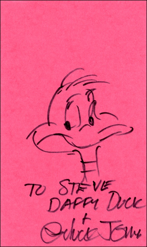 Original signed and inscribed felt tip sketch of Daffy Duck on a pink 3 x 5 card, signed and inscribed “To Steve, Daffy Duck & Chuck Jones.” In fine condition. R&R COA.