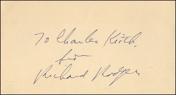Vintage fountain pen signatures, “Oscar Hammerstein,” and “To Charlie Keith from Richard Rodgers,” on individual off-white 5.5 x 3.25 government postcards. In fine condition, with light overall toning to both cards. R&R COA.