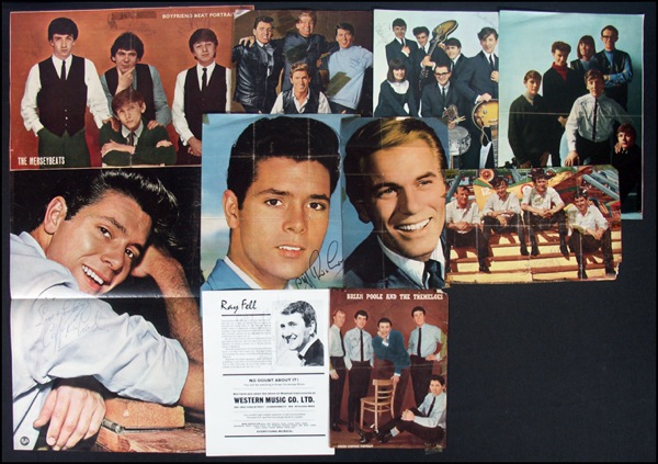 Lot of nine vintage magazine photos (several color), ranging in size from 8.75 x 10.75 to 16 x 10.5, each signed in ink by the artist(s) pictured. Included: The Applejacks (2, each signed by two); Adam Faith; Ray Fell and Jimmy Saville; Gerry and the Pacemakers; The Merseybeats (signed by three); Brian Poole and the Tremeloes; Cliff Richard (2) and The Searchers. In overall good to very good condition, with creasing, edge wear, scuffing to a few, adhesive residue remnants to a few. R&R COA.