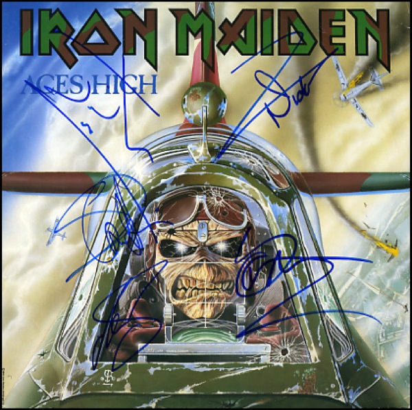 Aces High 12” single album signed on the front cover in blue felt tip by Bruce Dickinson, Adrian Smith, Steve Harris, Nicko McBrain and Janick Gers. In fine condition. The record is included. R&R COA.