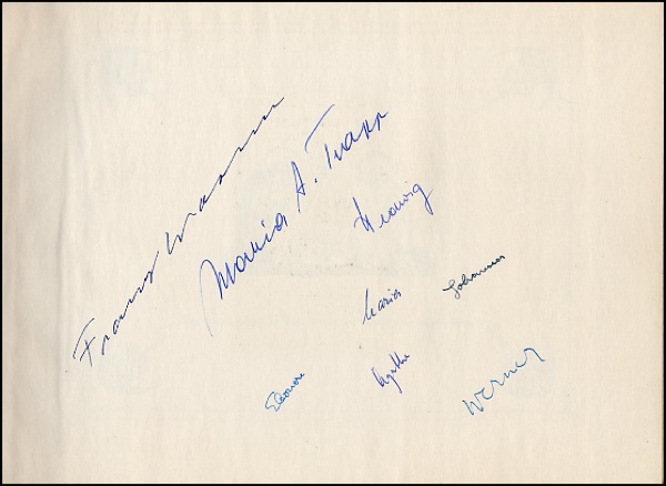 Signed book: The Trapp Family Book of Christmas Songs. NY: Pantheon Books, 1950. Hardcover, 11 x 8.5, 128 pages. Signed on the front free end page by eight: Maria A. Trapp, Hedwig [Trapp], Eleonore [Trapp], Maria [Trapp], Johannes [Trapp], Agathe [Trapp], Werner [Trapp], and editor/musical director Franz Wasner. Accompanied by an unsigned program from a live appearance. In fine condition, with previous owner’s bookplate, mild toning, a touch of wear to corners, and small stain to front cover. R&R COA.