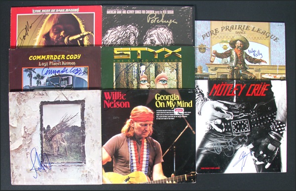 Lot of eight signed albums: The Grand Illusion signed by three members of Styx, including DeYoung and Shaw; Best Of Dave Mason, signed by Mason; Too Fast For Love signed by Tommy Lee and Vince Neil; Led Zeppelin IV signed by John Paul Jones; Hot Licks, Cold Steel and Truckers Favorites, signed by Commander Cody; Dance signed by Pure Prairie League member Mike Reilly; Georgia On My Mind, signed by Willie Nelson; and American Game and Song Activities signed by Pete Seeger. All but the Styx album are included. In fine condition. R&R COA.