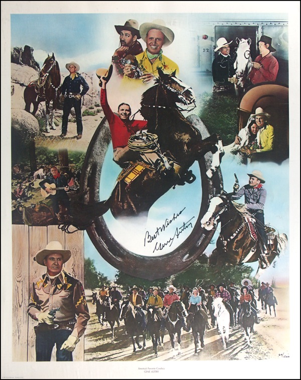 Color 24 x 30 lithograph, featuring many great images of Autry, signed in black felt tip, “Best Wishes, Gene Autry.” Rolled and in fine condition. R&R COA.
