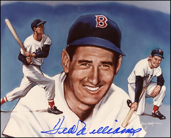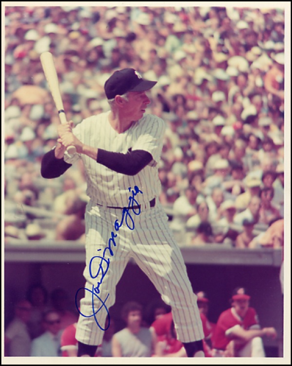 Color composite satin-finish 10 x 8 photo of Williams, signed in blue felt tip and a color glossy 8 x 10 photo of DiMaggio at the plate in an old-timer’s game, also signed in blue felt tip. In fine condition. COA Steve Grad/PSA/DNA and R&R COA.