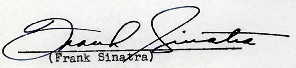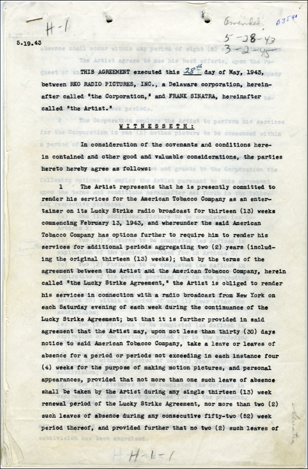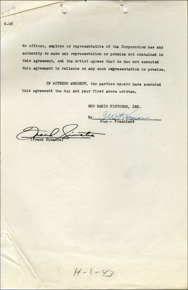 DS, 43 pages, 8.5 x 13, May 28, 1945. Three-picture deal between Sinatra and RKO Radio Pictures wherein Sinatra agrees to perform three future photoplays. The agreement references his commitment to Lucky Strike radio broadcasts. Fees noted are $25,000 for the picture “provided for in Article 2,” “$35,000 in connection with each picture provided for in subdivision b of article 3” and so on. The contract also notes that Sinatra will receive feature billing for all pictures; Sinatra grants the Corporation the right to “dub” his performance; revise the pictures in any manner; and he assigns publicity rights. Additionally, Sinatra authorizes the Motion Picture Relief Fund as his attorney-in-fact, etc. Very boldly signed on page 43 of the agreement. In fine condition, with usual punch and staple holes to top, scattered light creasing and expected age toning and edge wear. Higher and Higher (1943) was the first RKO picture for Sinatra of the above-referenced RKO deal. However, Louis B. Mayer was a fan of Sinatra's (his rendition of Ol' Man River moved him to tears). Mayer contacted RKO and bought out Sinatra's RKO contract in order to bring him to MGM. COA PSA/DNA and R&R COA.
