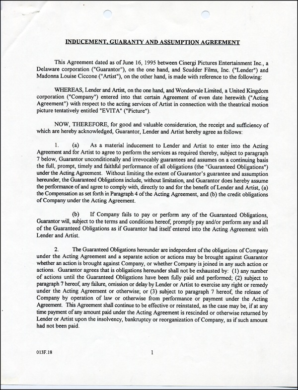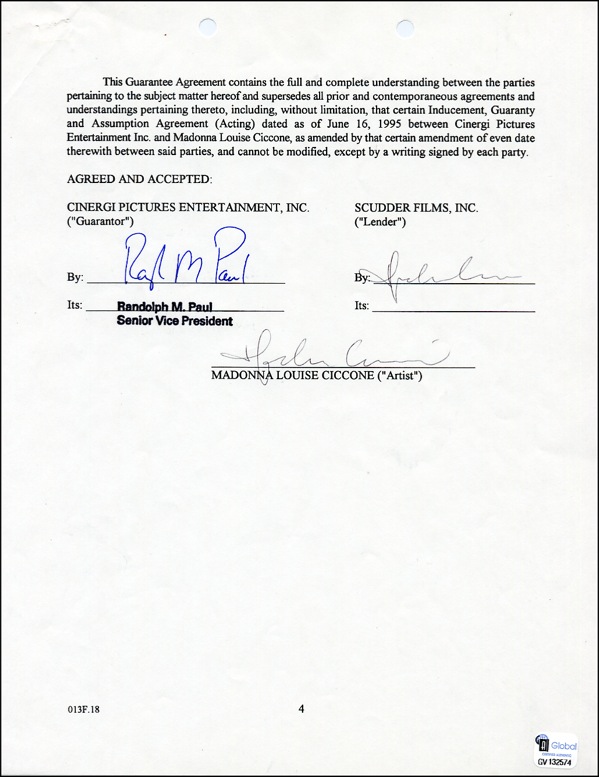DS, signed “Madonna Ciccone,” four pages, 8.5 x 11, June 16, 1995. Inducement, Guaranty and Assumption agreement between Madonna, Cinergi Pictures Entertainment and Scudder Films concerning the upcoming film entitled Evita. Nicely signed on the last page in black ink. In fine condition, with punch and staple holes to top edge. Accompanied by copies of COAs from PSA/DNA, Global/Epperson and R&R COA.