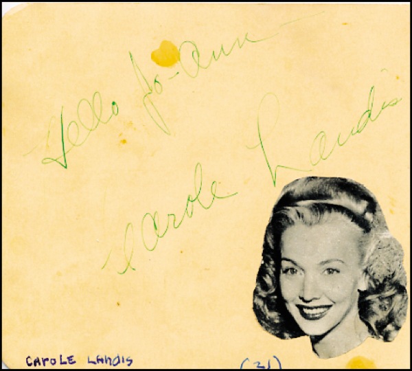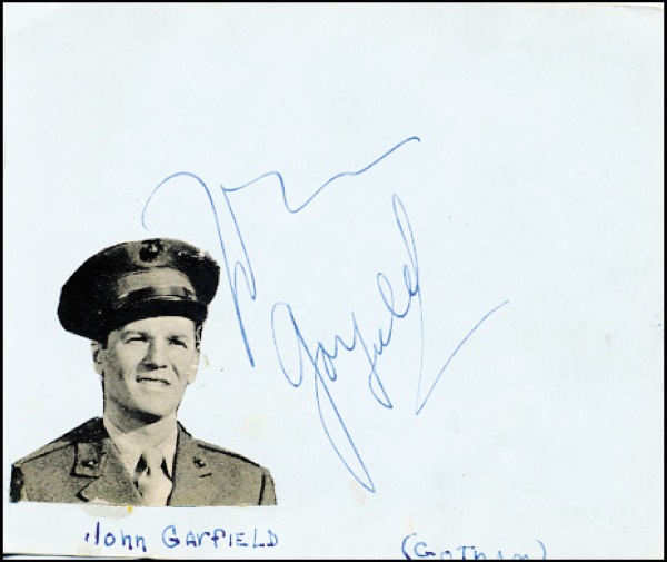 Vintage autograph album containing forty-three fountain pen signatures, including: John Garfield, Diana Lynn, Charles Coburn, Cedric Hardwicke, Carole Landis, Yvonne De Carlo, Dane Clark, Virginia Weidler, Milton Berle, Canada Lee, Ella Raines, Reginald Gardiner, Vera Zorina, John Howard, Andrea Leeds, John Robert Powers, Kevin O’Shea, Ilona Massey, Eleanor Powell, Stephen Crane, Eve Arden, Donald Cook, Diana Lynn, Margo, Edward Arnold, Richard Whorf, Peggy Ryan, Jim Brown, Louis Jourdan, Frank Latimore, Jeffrey Lynn, Ann Rutherford, Jess Barker, Annabella, Suzi Crandall, Patricia Knight, Cornel Wilde, Barry Sullivan, Victor Mature, Tony Martin, Martha O’Driscoll, Jimmy Dunn. In very good condition, with signatures on either side of each page, with several pages loose from spine, small photos of the respective actor affixed to some album pages, collector’s ink notations. R&R COA.