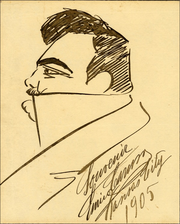 Magnificent original vintage signed fountain pen self-portrait profile caricature on an off-white 5.25 x 6.5 piece of artists cardstock. Signed at the bottom, “Souvenir Enrico Caruso, Kansas City 1905.” In fine condition. COA John Reznikoff/PSA/DNA and R&R COA.