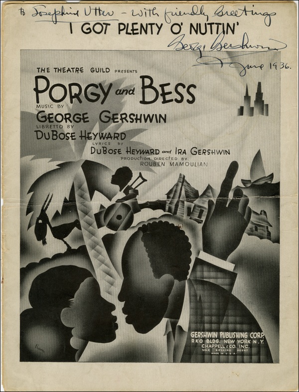 Sheet music, 9 x 12, eight pages, for I Got Plenty Of Nuttin’ from Porgy and Bess, signed and inscribed along the top of the cover in fountain pen, “To Josephine Utter - With friendly greetings, George Gershwin 1936.” In fine condition, with front cover detached from remainder of music, a few light creases, noticeable bisecting horizontal crease and some light soiling, none affecting bold signature and inscription. COA John Reznikoff/PSA/DNA and R&R COA.