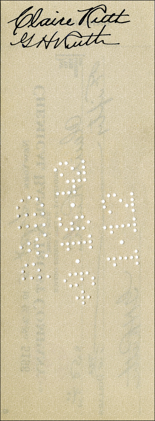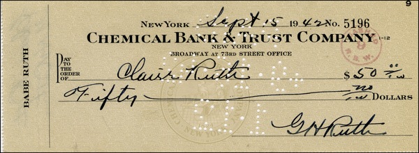 Personal check, 8.25 x 3, filled out and signed by Ruth, “G. H. Ruth,” payable to his wife, Claire Ruth for $50.00, September 15, 1942. Endorsed on the reverse by Claire Ruth, as well as by the Babe, “G. H. Ruth.” In very fine condition, with cancellation holes to body and a single bank stamp, not affecting either of Ruth’s signatures. COA Steve Grad/PSA/DNA and R&R COA.