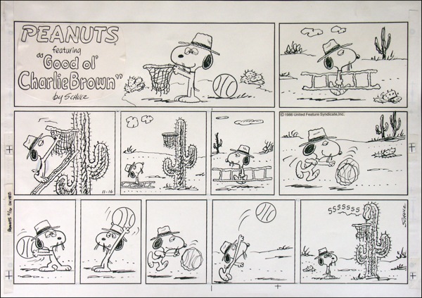 Original hand-inked eleven panel Peanuts Sunday comic strip, dated November 16, 1987 on a 24 x 17 piece of off-white artists cardstock, with a pasted on title. Strip shows Snoopy’s brother Spike anticipating a great game of basketball in the Needles desert, only to have the game ended suddenly by a cactus. Signed vertically in the last panel in black ink, “Schulz.” In fine condition, with two thin pieces of tape to vertical borders. R&R COA.