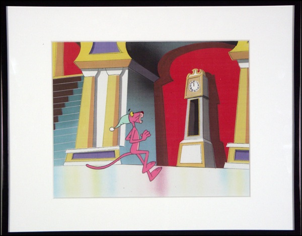 Original production cel from the Pink Panther cartoon series, 9.5 x 7.5. Matted and framed with a printed color background (not original) to an overall size of 14.5 x 11.5. In fine condition, with a tiny flake to paint. R&R COA.