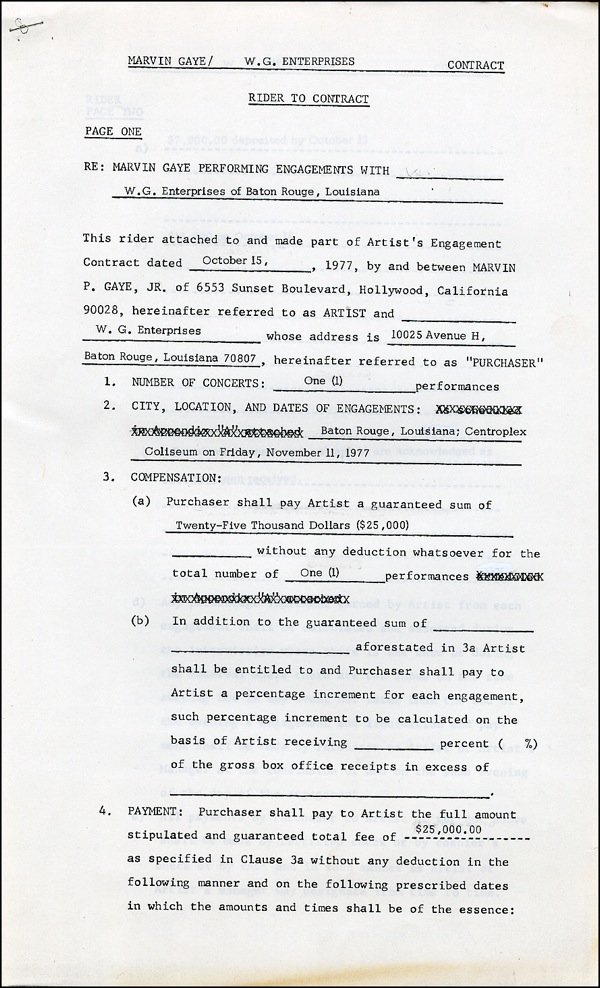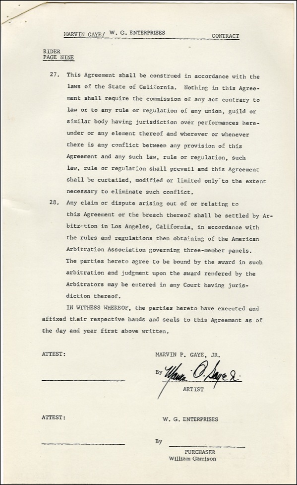 Talented singer/songwriter whose music reflected an uncommon social awareness; he was shot to death by his father in 1984. DS, nine pages, 8.5 x 14, October 15, 1977. Rider to a contract for Gaye’s performance of one concert in Baton Rouge for a fee of $25,000. Boldly signed “Marvin P. Gaye, Jr.” in black felt tip on the last page. In fine condition, with mild edge toning to bottom, staple at upper left. COA Roger Epperson/PSA/DNA and R&R COA.