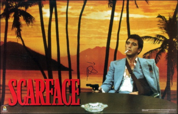 Very cool color 34.5 x 22.25 Scarface poster, quickly signed in blue felt tip. Rolled and in fine condition, with a few slight edge dings. R&R COA.