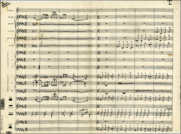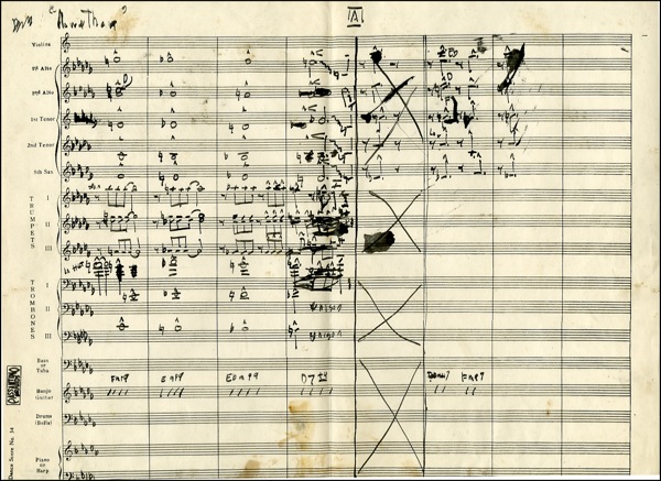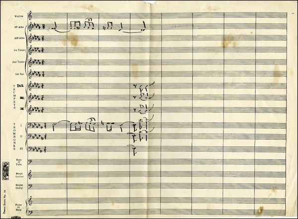 Saxophonist, band leader, and composer whose brilliant improvisatory skills and experimental spirit made him one of the most influential and highly regarded musicians in the history of jazz. After playing tenor and soprano sax with Dizzy Gillespie, Miles Davis and Thelonious Monk, he led his own groups and made such classic recordings as Giant Steps, My Favorite Things, and A Love Supreme. He died of liver cancer in 1967 at the age of forty-one. Unsigned music manuscript in black ink on three preprinted sheet of staff paper, 17 x 12.5, apparently for several instrumental parts, including violins, trumpets, trombones and drums, or a piece titled “Now & Then.” The manuscript consists of approximately one hundred measures in cut time, further bearing the notations “A” at the top of one page and “Bosy” at the top of a second page. The verso bears Coltrane’s ink notations on the reverse reading “Lauch,” “Launch,” and “The Evauncel,” as well as the Coltrane estate’s “2005 Jowcol Music” copyright ink stamp. In fine condition, with some scattered light toning and soiling and expected handling wear associated with a work in progress. COA Roger Epperson/PSA/DNA and R&R COA.