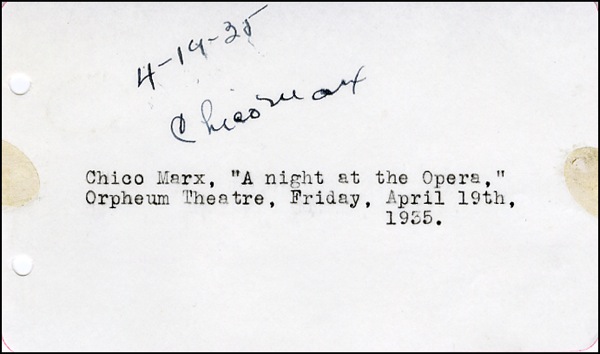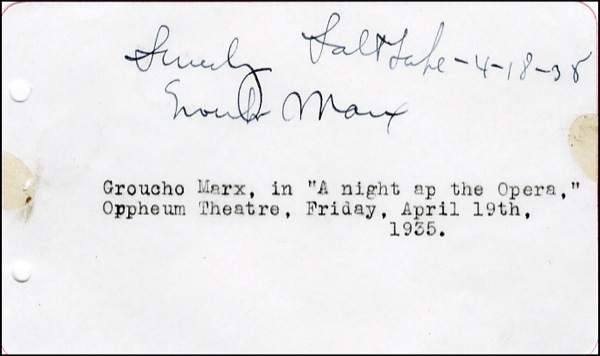 Vintage fountain pen signatures, “Sincerely, Groucho Marx, Salt Lake 4-18-35,” and “Chico Marx, 4-19-35,” on separate off-white 5 x 3 pages. In fine condition, with typed collector’s notations to bottom, punch holes to left edge and small mounting remnants to vertical sides. PSA/DNA COA and R&R COA.