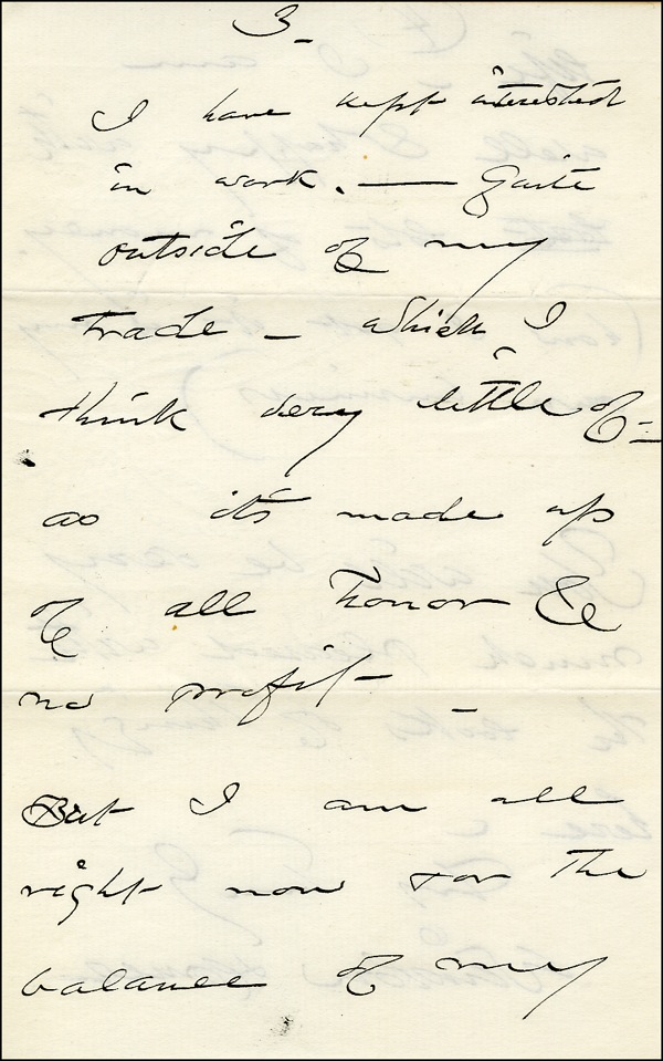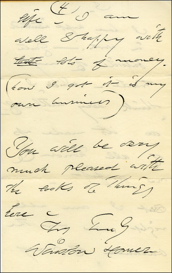 One of the foremost American painters of the nineteenth century. ALS, two pages both sides, 5 x 8, May 22, 1905. Homer writes to a lady friend from Maine. In part, “I have kept interested in work. Quite outside of my trade - which I think very little of - as it’s made up of all honor & no profit. But I am all right now for the balance of my life - I am & happy with lots of money (how I got it is my own business).” Accompanied by the original mailing envelope. In fine condition, with expected folds and a touch of trivial light toning. COA John Reznikoff/PSA/DNA and R&R COA.