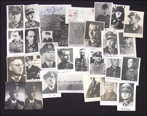 Lot of twenty-seven photos and one commemorative postal cover, including many vintage examples, each signed by a member of the German military; a few names are represented more than once. The signers include Fritz Hippler, Hans Mikosch, Werner Ranck, Reinhart Reche, Walter Reder, Erich Reuter, Hans Rösing, Erich Topp, Witte Dommes, Karl Ulrich, Walter Wenck, Fritz Bader, Otto Baum, H. H. Behrend, Ernst Biehler, Theodor Busse, Karl Dönitz, Heinrich Eberhart, Hugo Eichhorn, Walther Fellgebel, Heinz Gericke, Arthur Juttner, Ernst König, Otto Kumm, Hans-Gunther Lange, Karl F. Merten, and Friedrich Ruge. In fine condition, with occasional minor bends and surface impressions and a few scattered brushes to signatures. R&R COA.