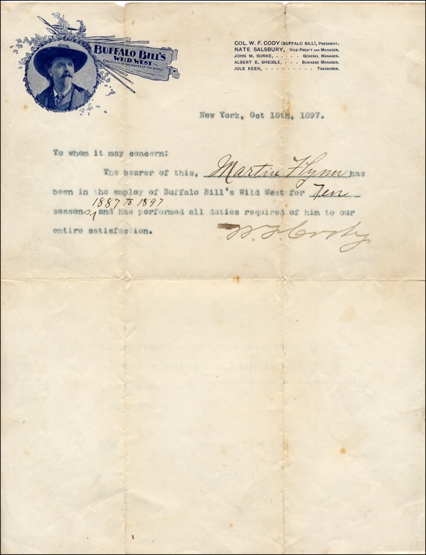 TLS signed “W. F. Cody,” one page, 8.5 x 11, Buffalo Bill’s Wild West letterhead, October 18, 1897. Short letter of recommendation for an employee. In full, “The bearer of this, Martin Flynn has been in the employ of Buffalo Bill’s Wild West for ten seasons, 1887 to 1897, and has performed all duties required of him to our entire satisfaction.” In good condition, with moderate folds, scattered foxing and toning, a few small fold separations and light mirroring of typed text from premature folding. COA John Reznikoff/PSA/DNA and R&R COA.