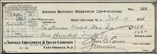 Business check, 8.5 x 3, filled out in another hand and signed by Edison, payable to Eastman Kodak Stores, Inc. for $126.00, February 9, 1928. The memo line indicates the purchase of a Graflex [camera] and assorted supplies. In fine condition, with bisecting vertical crease and usual punch cancellation, touching signature. COA John Reznikoff/PSA/DNA and R&R COA.