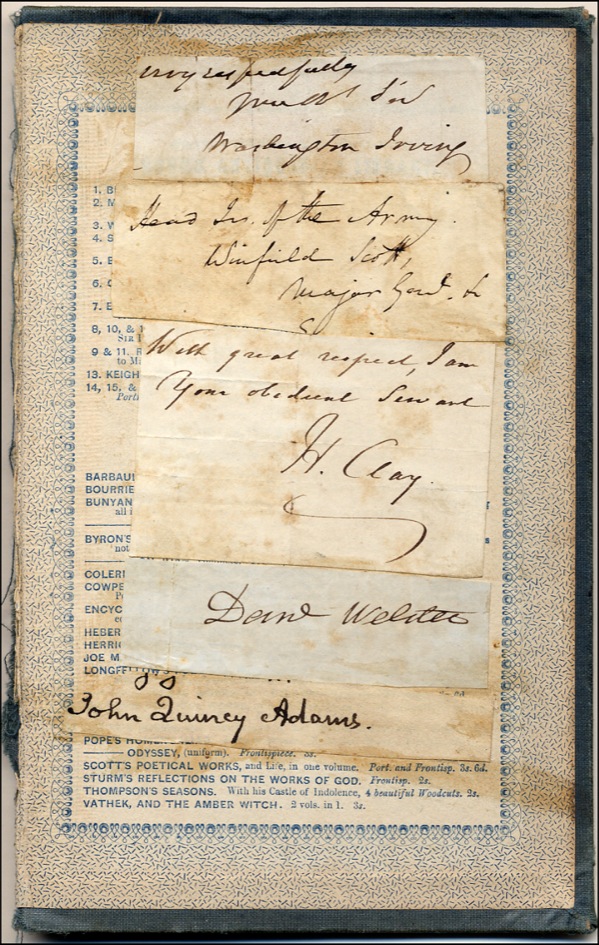 Ink signatures of John Quincy Adams, Henry Clay, Daniel Webster, Winfield Scott and Washington Irving on individual clipped slips, all affixed to the inside of the detached back cover of an unknown book. Clay, Irving and Scott signatures feature more words in their hands. In very good condition, with moderate toning to slips and book cover and a few light folds to several slips. COA John Reznikoff/PSA/DNA and R&R COA.