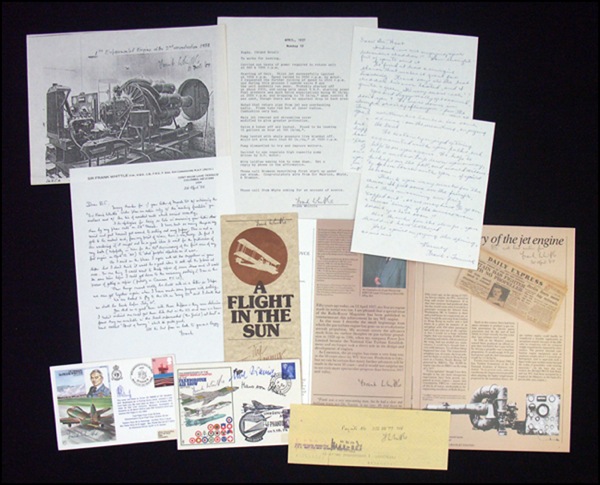 Inventor of the jet engine. Lot of nine signed items: two ALS, a souvenir typescript with details of an early jet test, a photocopied photo of a jet engine, a souvenir brochure, an endorsement signature on a check, a copy of Rolls-Royce magazine featuring “Fifty Years of Jet Engines,” and two commemorative postal covers, each additionally signed by one or two pilots. Accompanied by the original hand-addressed envelope for one of the letters. In fine condition. R&R COA.