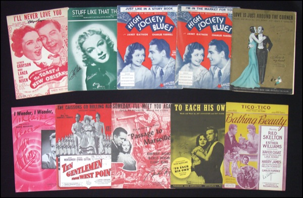 Lot of ten pieces of mostly movie-related sheet music, each signed in ink by an actor or actress from the respective film: Olivia deHavilland, Red Skelton, Maureen O’Hara (inscribed), Michele Morgan, Van Johnson, Kitty Carlisle, Janet Gaynor, Charles Farrell (inscribed), Betty Hutton, and Kathryn Grayson. In very good condition, with usual light handling wear, scattered light toning and soiling, a few with owners’ signatures or cover separation, and one with mounting remnants on back cover. R&R COA.