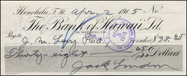 Check, 7 x 2.75, filled out and signed by London, payable to J. M. Levy & Co. for $38.65, April 2, 1915. In fine condition, with stamp and cancellation mark to body, not affecting nice signature. R&R COA.