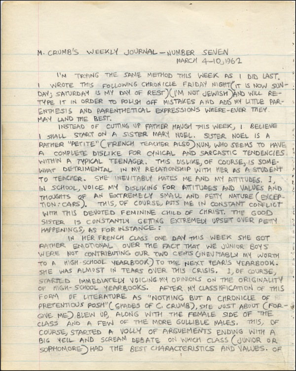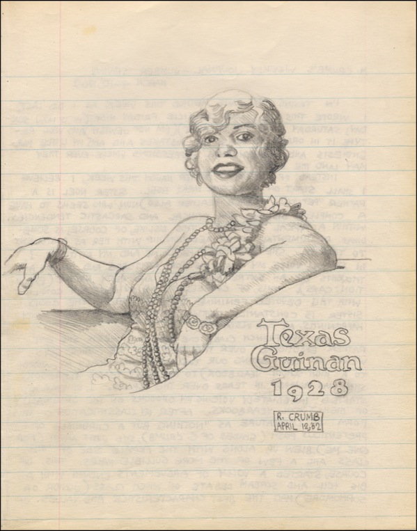 Original nicely done signed pencil sketch of Texas Guinan on an off-white 6.75 x 8.5 lined sheet from Crumb’s personal journal. Sketch is signed “R. Crumb, April 12, ‘62.” Reverse of page bears a lengthy handwritten journal entry by Crumb, dated March 4-10, 1962, recounting a rather heated encounter over yearbooks with Sister Mary Noel, “Instead of cutting up Father Haugh this week, I believe I shall start on Sister Mary Noel…She got rather emotional over the fact we junior boys were not contributing our two cents…to next year’s yearbook. She was almost in tears over the crisis. I, of course, started immediately voicing my opinions on the originality of high school yearbooks…This of course started a volley of arguments ending with a big yell and screaming debate.” In fine condition. R&R COA.