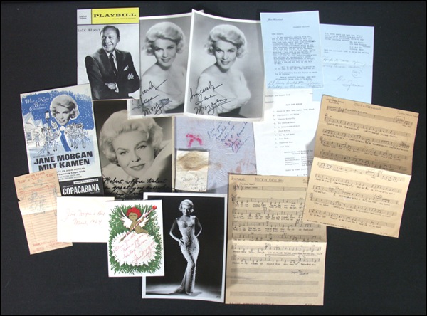 Archive includes two rolls of 8mm film labeled "Thanksgiving Day Parade 1965 with Jane Morgan"; postcard from Cairo "To Robert Champion from Jane"; notes, cards, some on her personal stationery, and a letter on her stationery as Jane Weintraub (as she was married to agent and producer Jerry Weintraub; locks of her hair; approximately 25 studio photos, many signed, many with Robert Champion or Jack Benny; newspaper clippings of Ms. Morgan; broadsides; Playbill for Ziegfeld Theatre; music score; receipts; biography by Bob Perilla Associates; 17 Jane Morgan photo albums presented to Robert Champion in the 1960s; traces of Ms. Morgan's lipstick and makeup on a Kleenex from the NBC Johnny Carson show 1966. In very good overall condition. R&R COA.