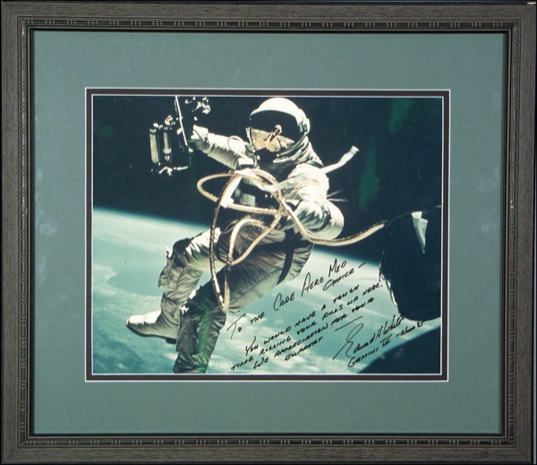 Astronaut who died tragically in the Apollo I flash fire, and who was the first American to walk in space on June 3, 1965. Color 14 x 11 photo of White making his historic space walk, signed and inscribed in black felt tip “To the Cape Aero Med Office-You would have a tough time rolling your pills up here. We appreciation [sic] for your support, Edward H. White II Gemini IV-3 June ‘65.” Nicely double matted and framed to an overall size of 20.5 x 18. In fine condition, with a few light surface marks. COA Scott Cornish, COA PSA/DNA and R&R COA.