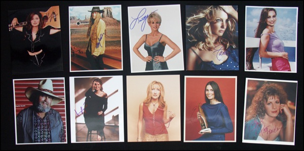 Lot of ten color glossy 8 x 10 photos, each signed in felt tip or ink by the respective country star pictured. Signers are: Shania Twain, Willie Nelson, Lorrie Morgan, Faith Hill, Crystal Gayle, Charlie Daniels, Amy Grant, Lee Ann Womack, Patty Loveless and one other. In fine condition. R&R COA.