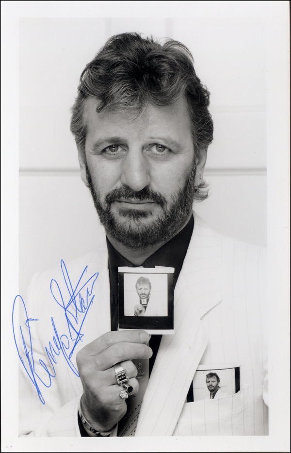 Satin-finish 3.5 x 5.5 photo of Ringo holding a photo of Ringo, signed in blue ballpoint. In fine condition. COA Roger Epperson/PSA/DNA and R&R COA.