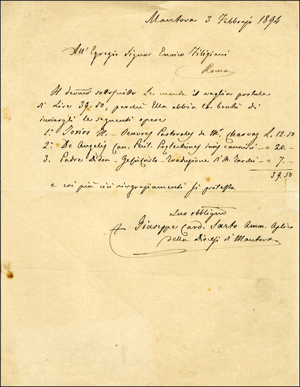 Pope, 1903-14. He condemned theological modernism and revolutionary movements in his encyclical Pascendi (1907), but was a champion of social reforms. He reformed the liturgy, re-codified canon law, and was canonized in 1954. DS, in Latin, signed as Cardinal, “Giuseppe Cardinal Sarto,” one page, 7.5 x 9.75, February 3, 1894. This document lists three payments for postage for books. Accompanied by a very nice color photo postcard image with a Vatican postmark. In very good condition, with a vertical fold through a letter of the signature, scattered areas of light toning, a couple of small areas of trivial soiling. R&R COA.