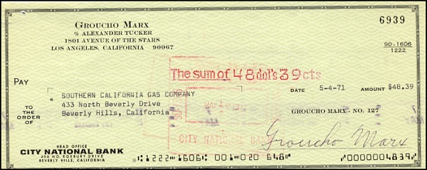 Personal check, 8.5 x 3.25, filled out in type and signed by Marx, payable to Southern California Gas Company for $48.39, May 4, 1971. In fine condition, with expected stamps, one lightly over first two letters of signature. R&R COA.
