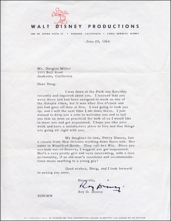 Roy Disney, employer and cupid? “My daughter-in-law, Patty Disney, has a cousin from New Orleans working down there now…She’s a very pretty girl and very interesting…if an old man’s reactions and recommendations mean anything to a young guy.”