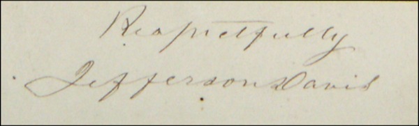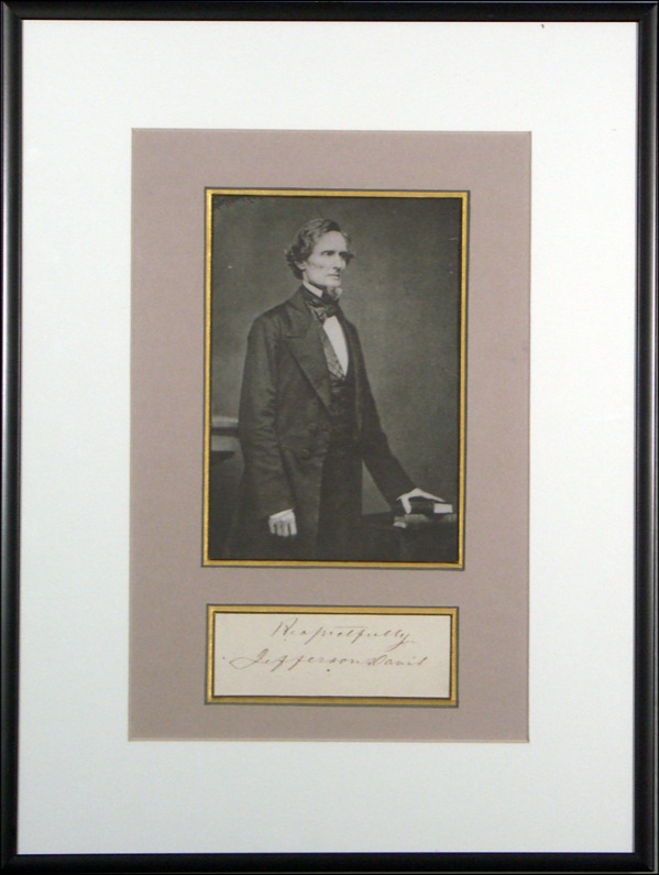 President of the Confederacy. Ink signature, “Respectfully, Jefferson Davis,” on an off-white 4.5 x 1.75 slip. Triple matted and framed with a nice portrait of Davis, to an overall size of 12.5 x 16.5. In fine condition. COA John Reznikoff/PSA/DNA and R&R COA.