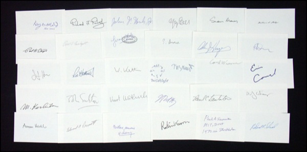Lot of thirty ink and felt tip signatures of Nobel Prize winners on individual white 5 x 3 cards. Signers are: Kary B. Mullis (1993 Chemistry), Richard Roberts (1993 Medicine), John Nash (1994 Economics), George Olah (1994 Chemistry), Seamus J. Heaney (1995 Literature), William Phillips (1997 Physics), Dr. Paul D. Boyer (1997 Chemistry), Robert Furchgott (1998 Medicine), Gerardus Hooft (1999 Physics). Gunter Blobel (1999 Medicine), Alan J. Heeger (2000 Chemistry), Arvid Carlsson (2000 Medicine), James Heckman (2000 Economics), Leland H. Hartwell (2001 Medicine), Wolfgang Ketterle (2001 Physics), R. Timothy Hunt - who added a sketch of 'The Cell Cycle' (2001 Medicine), Carl E. Wieman (2001 Physics), Eric Cornell (2001 Physics), Masatoshi Koshiba (2002 Physics), John Sulston (2002 Medicine), Kurt Wuthrich (2002 Chemistry), Robert Horvitz (2002 Medicine), Paul C. Lauterbur (2003 Medicine), Avram H. Hershko (2004 Chemistry), Aaron Ciechanover (2004 Chemistry), Edward Prescott (2004 Economics), Yves Chauvin (2005 Chemistry), J. Robin Warren (2005 Medicine), Paul Samuelson (Economics) and Richard R. Schrock (2005 Chemistry). In fine condition. R&R COA.