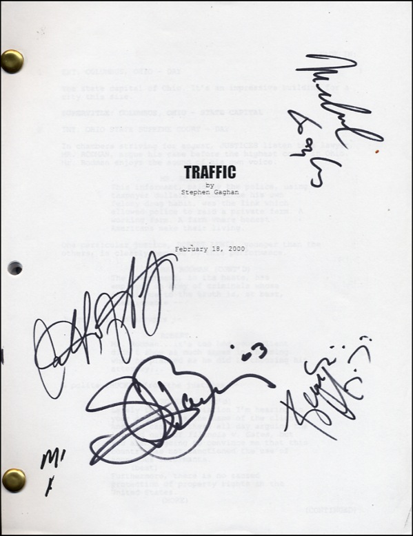 Complete brad-bound copy of the Oscar-winning screenplay, signed on the cover in black felt tip by four: Michael Douglas, Catherine Zeta-Jones, Benicio Del Toro, and Stephen Bauer. In fine condition. R&R COA.