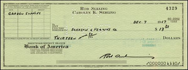 Personal check, 8.25 x 3, filled out and signed by Serling, payable to Jackson & Perkins Co. for $13.30, December 7, 1967. In fine condition, with usual punch cancellations and bank stamps well away from signature. R&R COA.