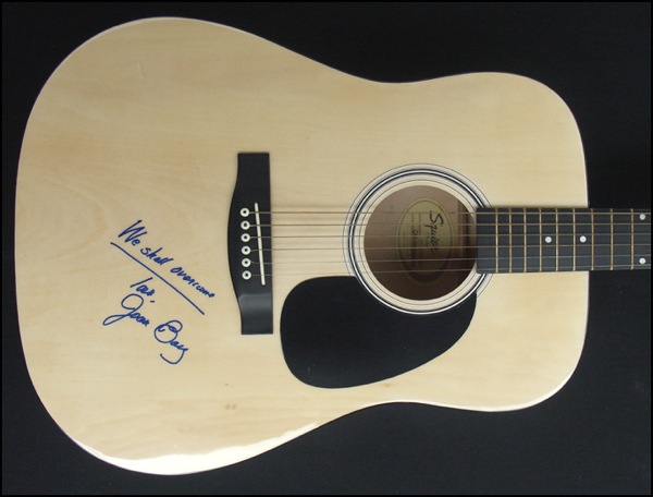 Wood grained Fender Squier six string acoustic guitar, signed on the body in blue felt tip, “We Shall Overcome. Love, Joan Baez.” In fine condition. R&R COA. Oversized.