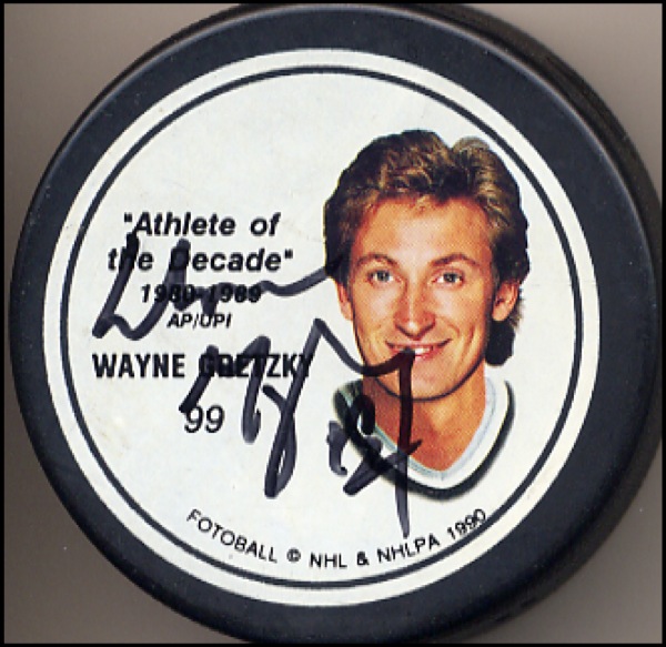 Lot of two signed items. Sports Illustrated magazine, dated February 18, 1985, featuring the ‘Great One’ on the cover, signed in blue felt tip; and a very nice Los Angeles Kings Gretzky photo-puck, signed on the image side in black felt tip. In fine condition, with mailing label to cover of magazine. COA Steve Grad/PSA/DNA and R&R COA.