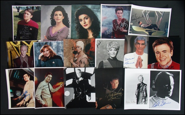 Lot of twenty-four 8 x 10 and 10 x 8 photos, most color, each signed in ink or felt tip, several signers also adding their character names: Wil Wheaton, Marina Sirtis (two), Nana Visitor, Gary Sinise, Bill Mumy, Gates McFadden, BarBara Luna, Jennifer Lien, Mark Leonard, Walter Koenig (two), David Hedison, Erin Gray (two), Jerry Doyle, Jeff Conaway (four), Mira Furlan, Frank Gorshin (two), and one other. In fine condition, with a few scattered brushes and dings. R&R COA.