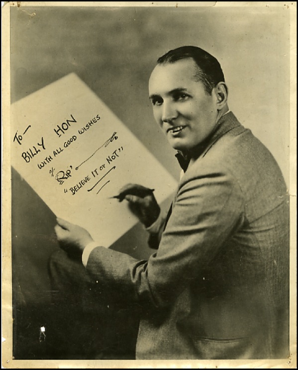 Vintage glossy 8 x 10 photo of Ripley holding his sketch pad, signed and inscribed in fountain pen to fellow cartoonist Billy Hon, “To - Billy Hon, with all good wishes of Rip’ ‘Believe It Or Not.’” Accompanied by an unsigned 10 x 8 Bull photo of Hon and a young boy, who bears a striking resemblance to Jackie Cooper. In very good condition, with tack holes and tears to edges, small hole to lower left and scattered creases and surface marks. R&R COA.