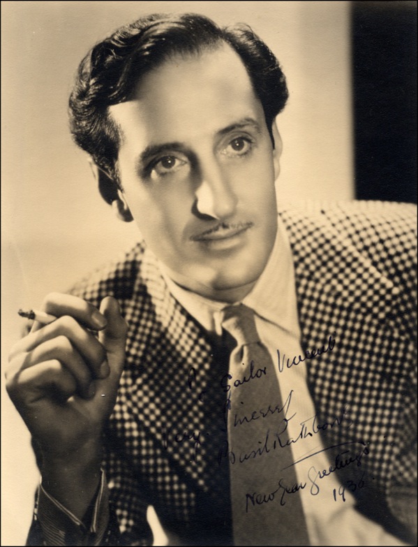 Vintage sepia matte-finish 7.25 x 9.5 photo of Rathbone in a checkered jacket holding a smoldering cigarette, signed and inscribed in fountain pen “To Sailor Vincent, Very sincerely, Basil Rathbone, New Year Greetings 1938.” Lightly trimmed edges, otherwise fine condition. PSA/DNA COA and R&R COA.